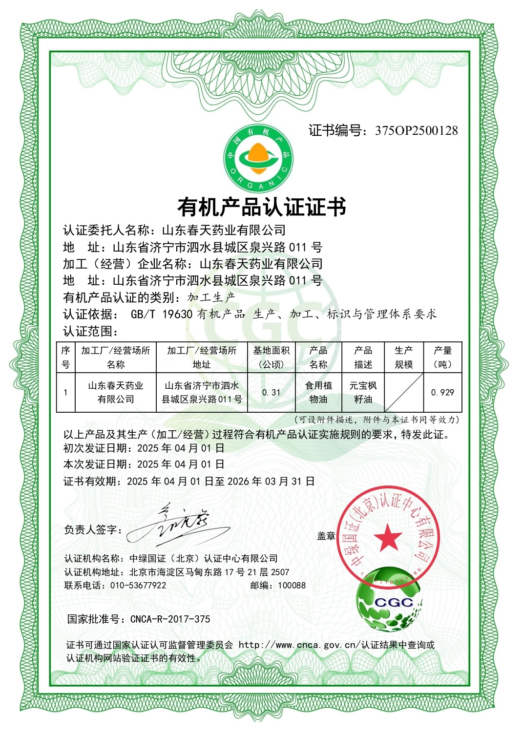 来源:喜 讯!山东春天药业有限公司元宝枫野生采集基地、种植基地元宝枫籽及元宝枫籽油荣获有机产品认证-公司新闻-山东春天药业有限公司